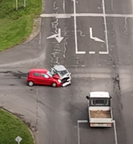 Szemből refi+az út közepén álló autó = fedélzeti videó